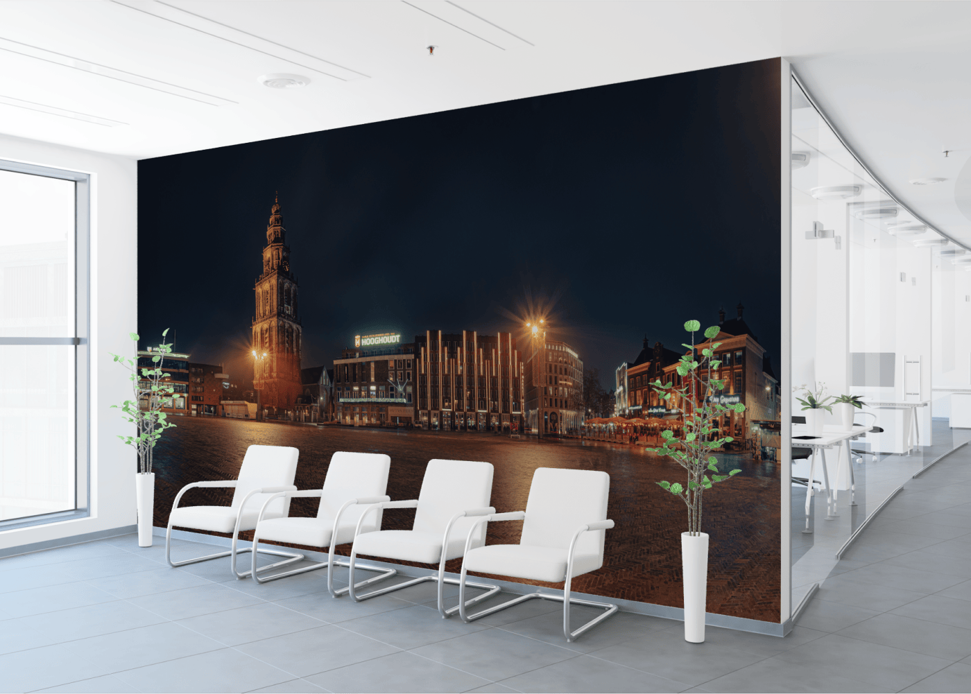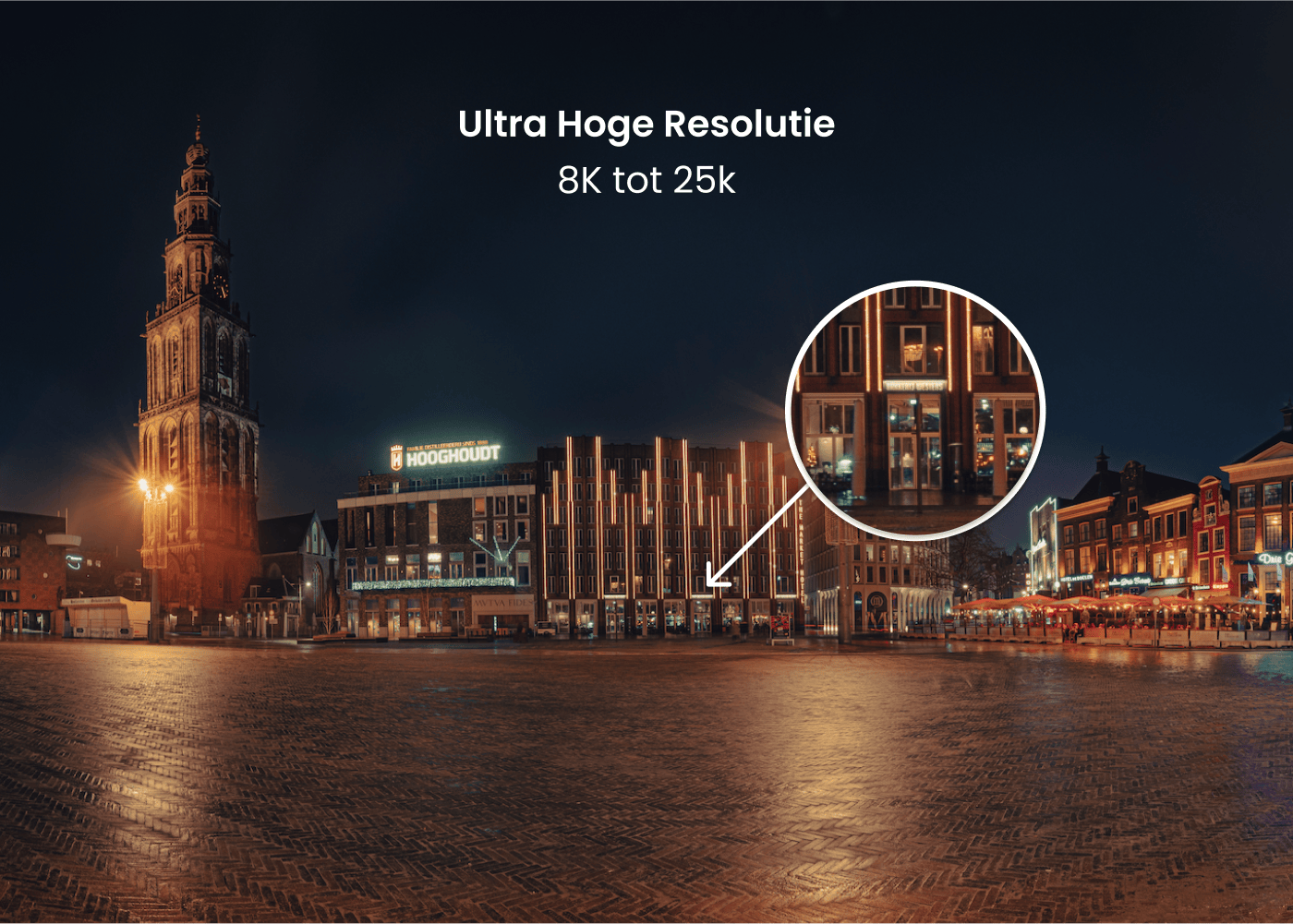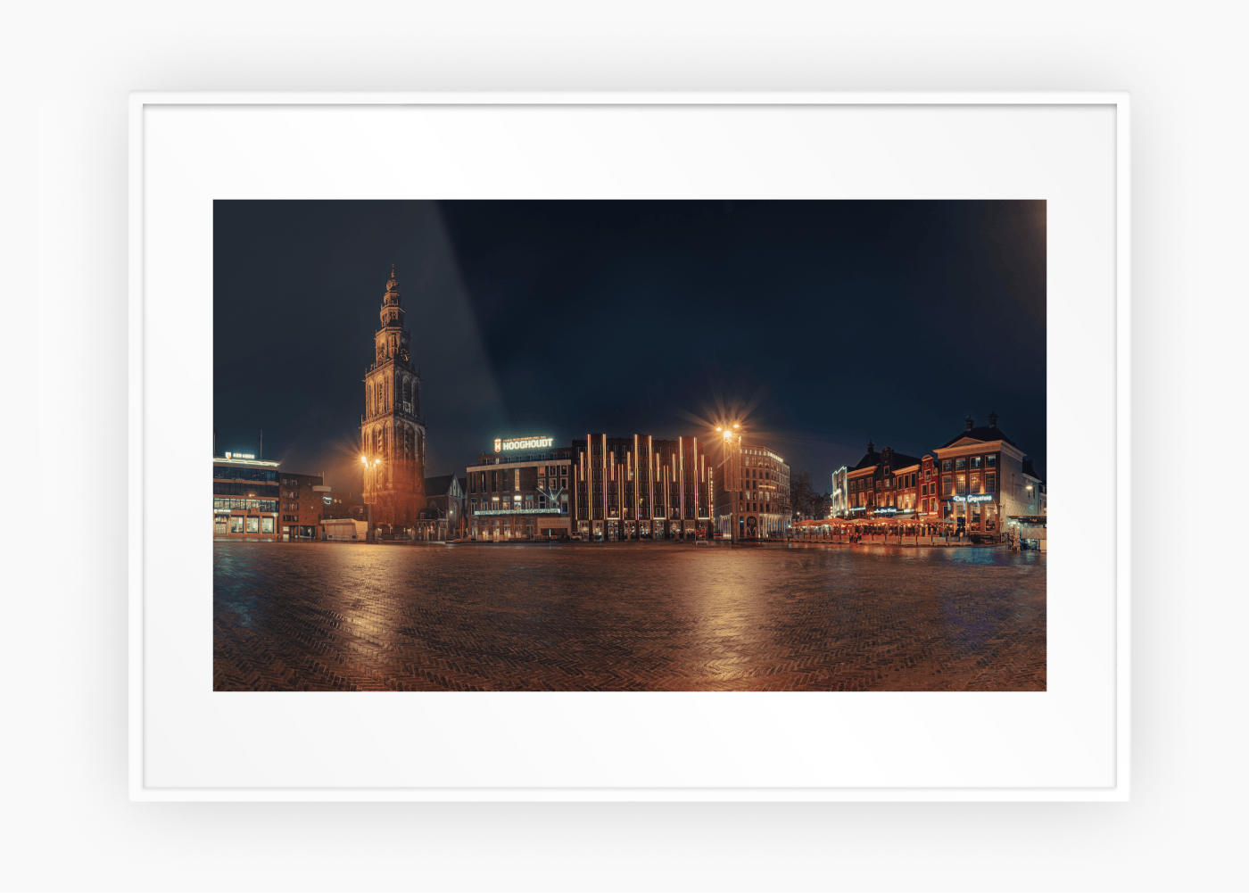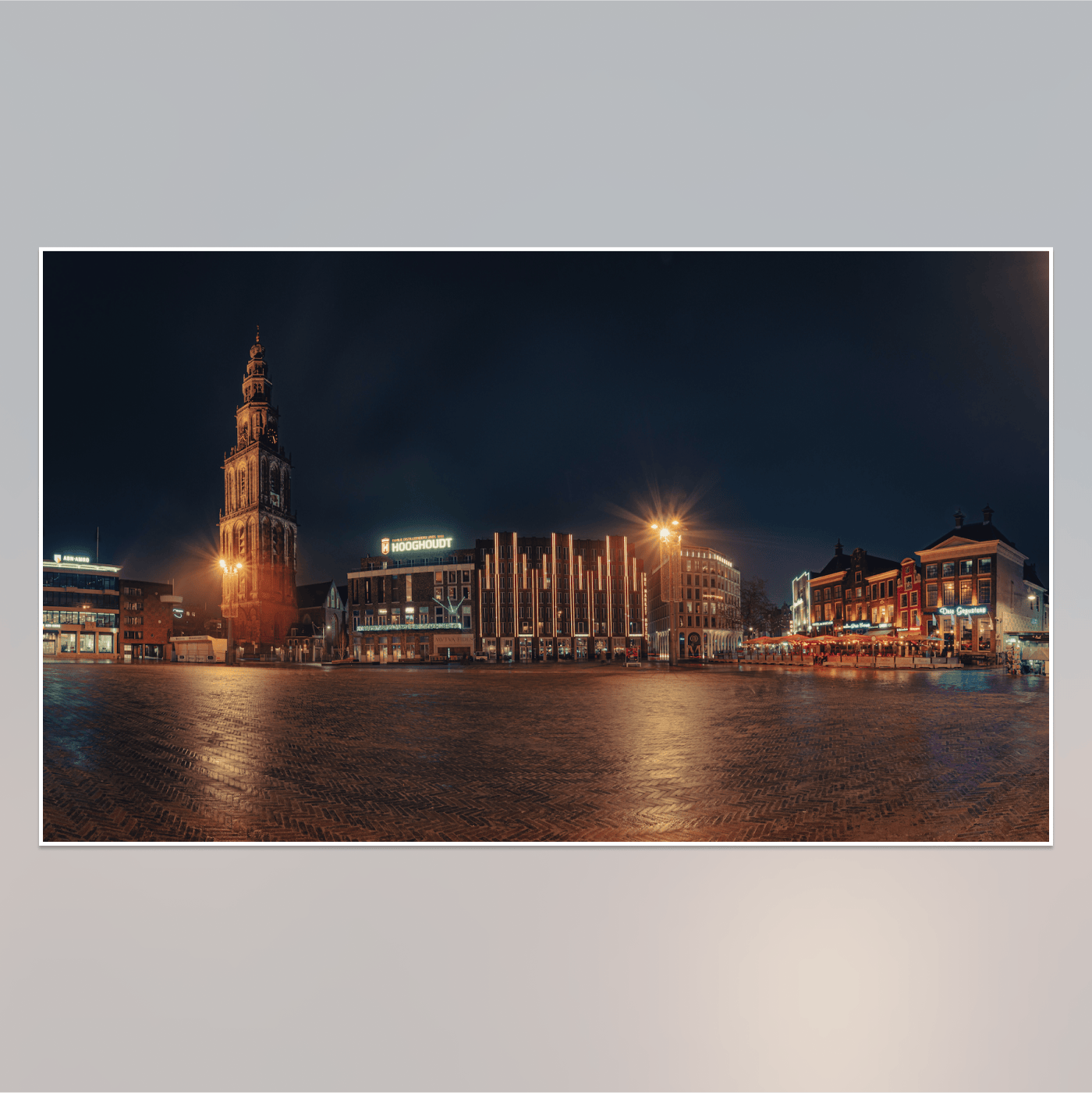 De bruisende sfeer van de Grote Markt, gevangen in één krachtig beeld. Op deze foto schittert het iconische, verlichte logo van Hooghoudt naast de statige Martinitoren en de sfeervolle terrassen van De Drie Gezusters.